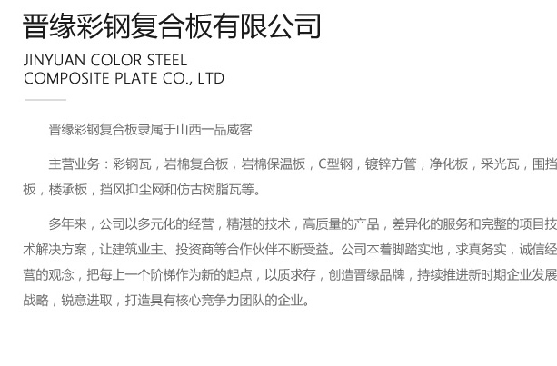 晋缘彩钢复合板有限公司拥有一套完整的钢结构生产设备,和复合板生产线,可为客户提供钢结构生产、加工、安装一条龙服务。公司秉承“质量保证、诚实守信、合作共赢”的经营理念,赢得了广大客户的肯定与支持。诚挚欢迎广大新老客户前来洽谈合作!